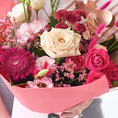 An on trend gift box handcrafted by their local florist featuring blooms in cerise and purple tones, with soft pink, peach or lilac shades. It might also feature dried flowers or foliage painted in copper or rose gold.