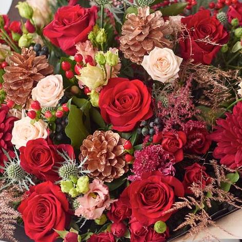 One of our bigger festive bouquets, this one is a stunning arrangement of fresh Christmassy flowers, expertly chosen by a local florist.