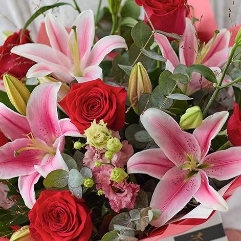 A gorgeous mix of the finest red roses, striking pink oriental lilies and other romantic blooms. A fiery and passionate bouquet for a Valentine's Day sweetheart.
