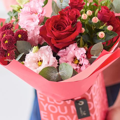 A gorgeous mix of romantic blooms, exquisitely arranged by an artisan florist and safely tucked in a beautiful giftbox. It'll feature blooms in classic Valentine's colours including cerise, burgundy and soft pink.